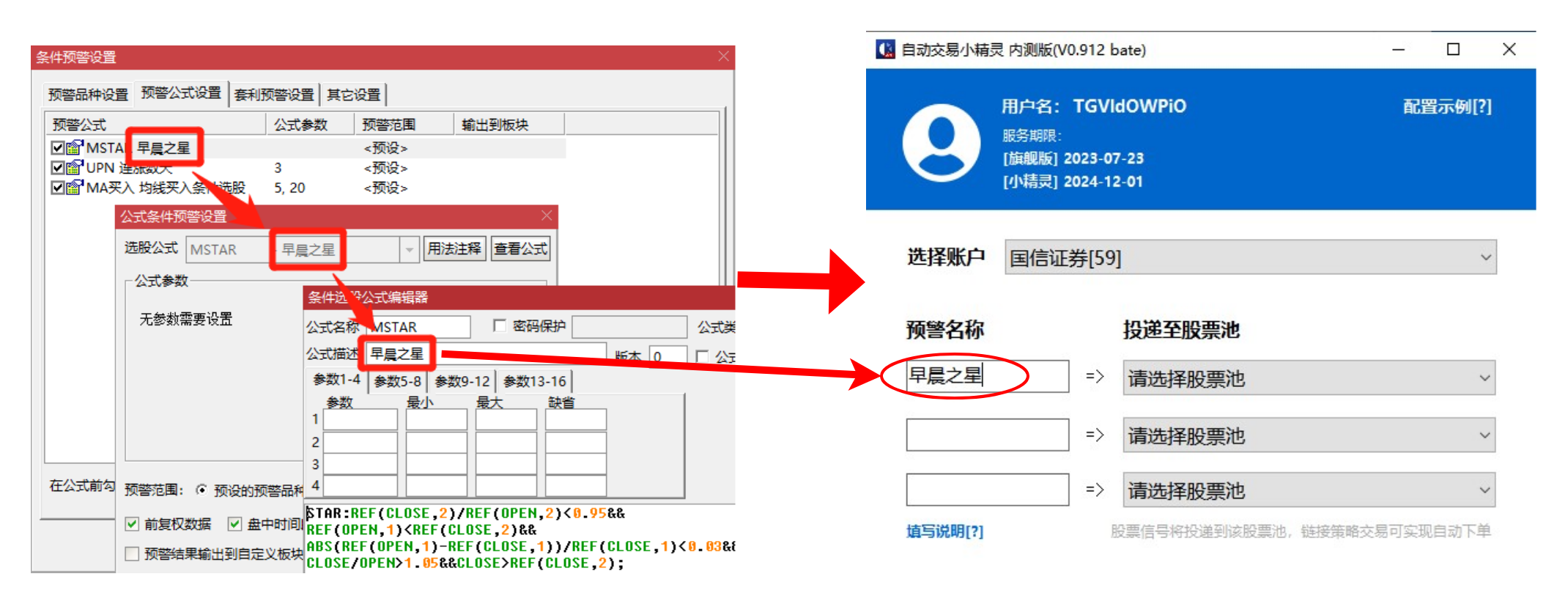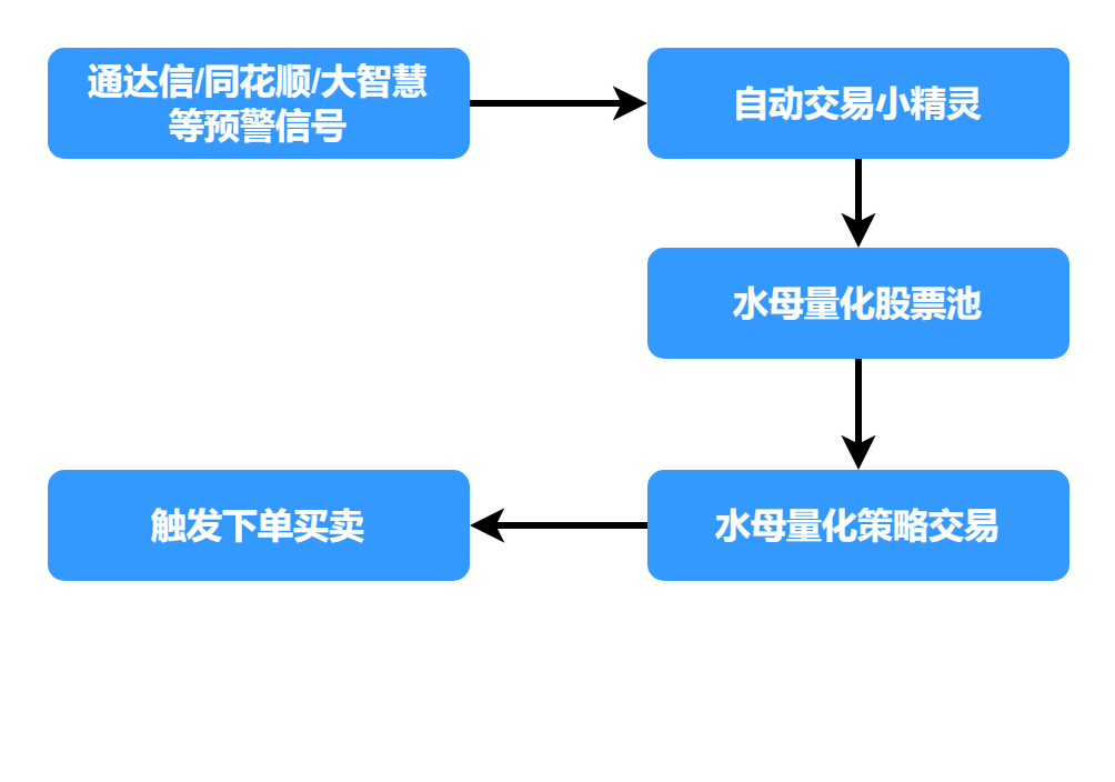 感谢使用水母量化交易平台的辅助工具:【自动交易小精灵】,本软件的主要功能,是把第三方行情软件的公式预警信号,投递到您水母量化平台相关账户的股票池,结合策略交易功能对股票池进行实时监控,即可实现从[公式预警信号]到[自动下单交易]的流程 ,满足各位对第三方行情软件的指标公式自动交易的需要。