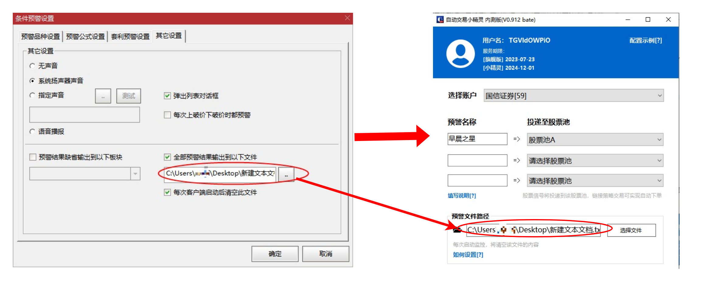 5. 在条件预警设置中的其他设置,必须指定把预警结果输出到文件,并在预警文件路径中填写准确的文件地址。注意:需要先建立一个空白的txt文档,然后在通达信条件预警设置中的其他设置,将全部预警输出到以下文件打开,并将将空白的txt文档路径添加到该输入框上。