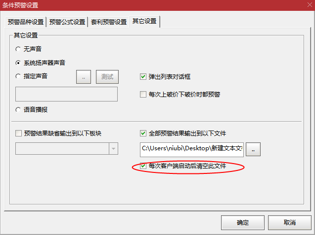4. 请在条件预警设置的其他设置中的【全部预警输出到以下文件】处,选择每次客户端启动后清空此文件,否则建议每天使用前打开输出的文件删除前一天的选股记录并保存,保持该文件开盘前为空的状态。