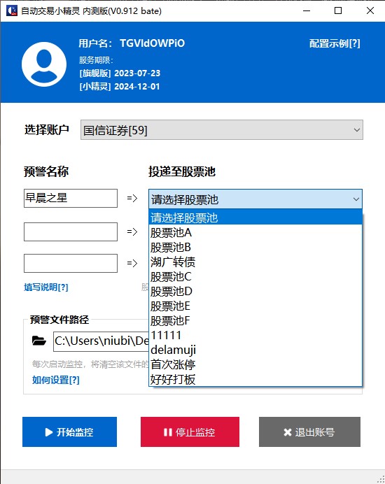 · 该账号已经创建好待添加”预警股票”的股票池;
