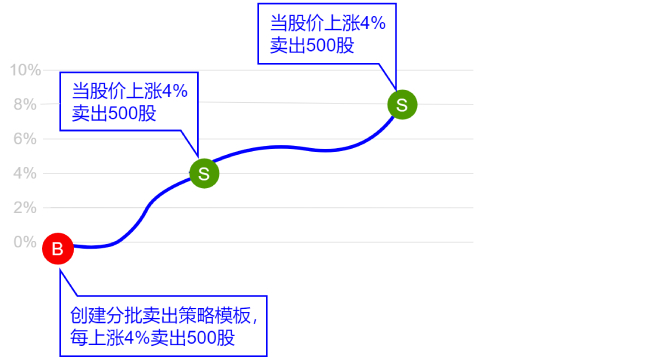 李先生持有某只股票,成本价在13元,李先生认为的阶段高点为15元,但不确定该股票的未来走势,遂准备分批止盈。利用分批卖出这个策略模板进行设置,首先将监控价设置为15元,涨跌类型选择差价,每上涨…卖出填写0.5,每次卖出500股,打开预授权并提交,这样就会在股价到达15.5元时卖出500股,并且每上涨0.5元都会卖出500股,直至将持仓卖光。