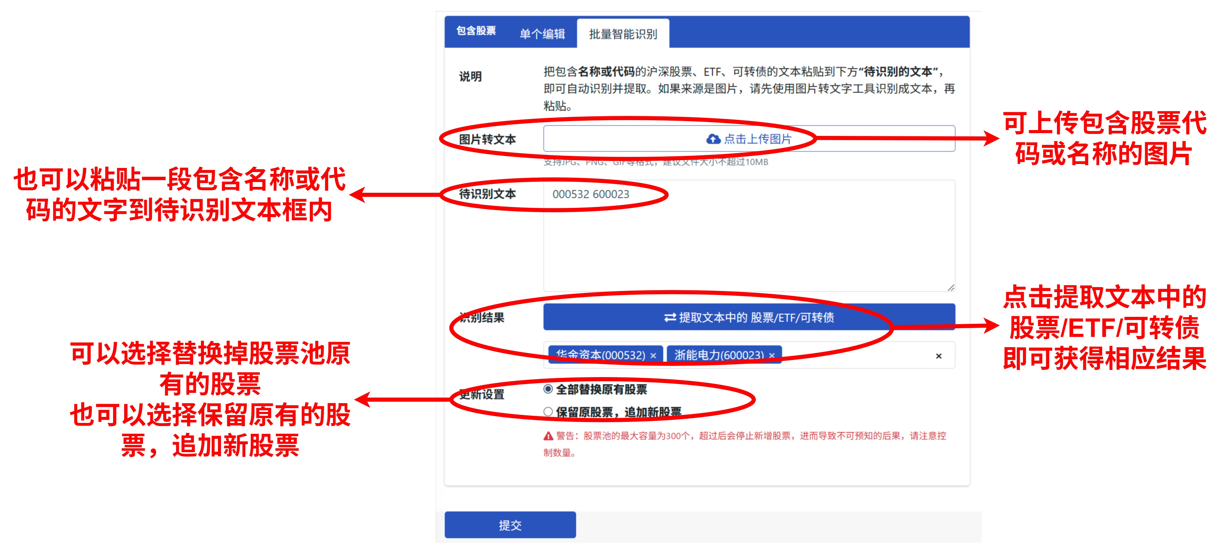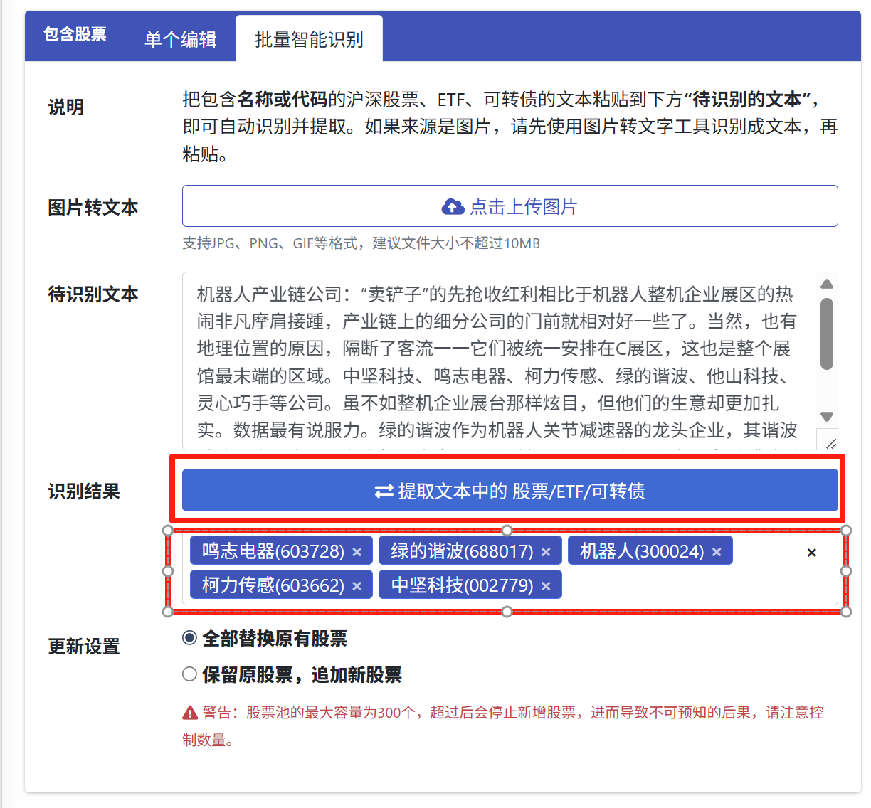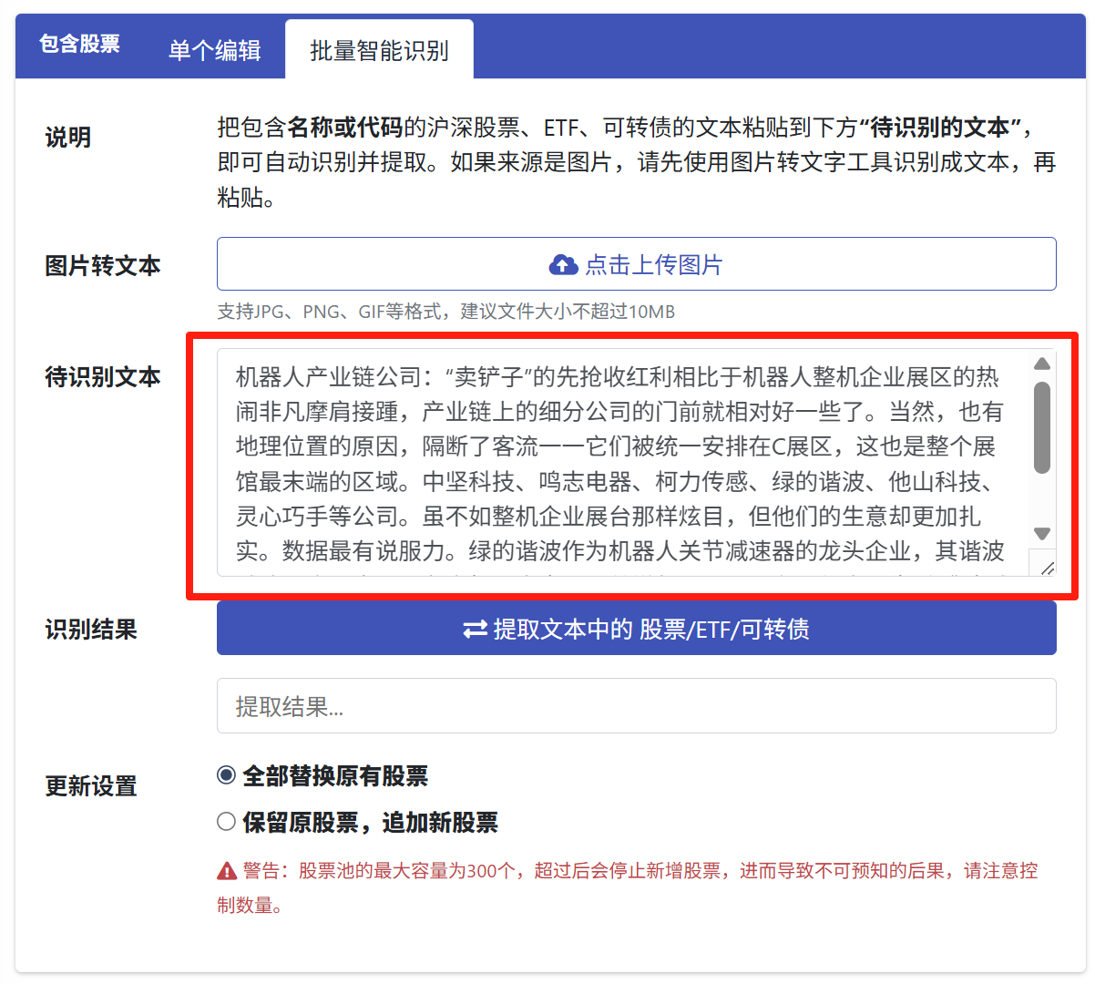点击提取文本中的股票/ETF/可转债,系统会将文本中提到的股票添加到提取结果中。