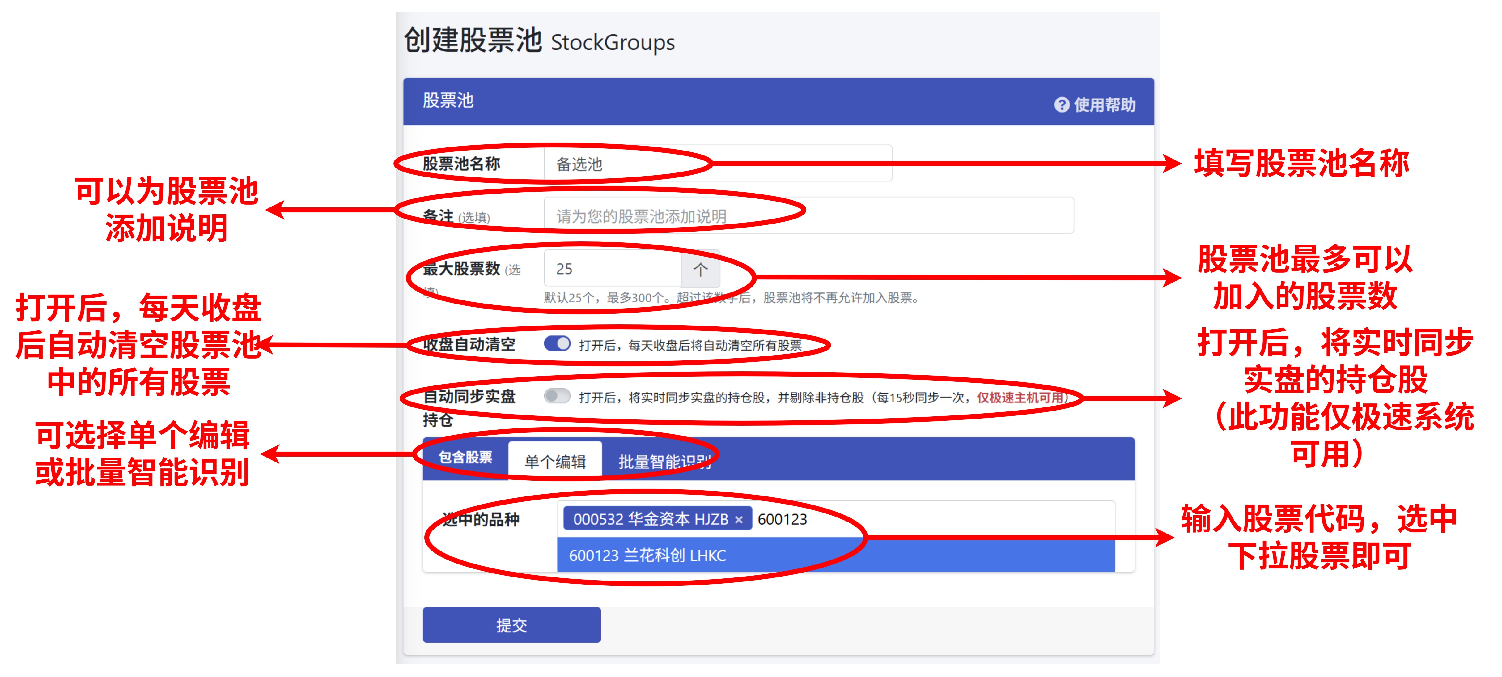 为股票池制定一个名称,也可以添加必要的备注说明,方便后续的管理。