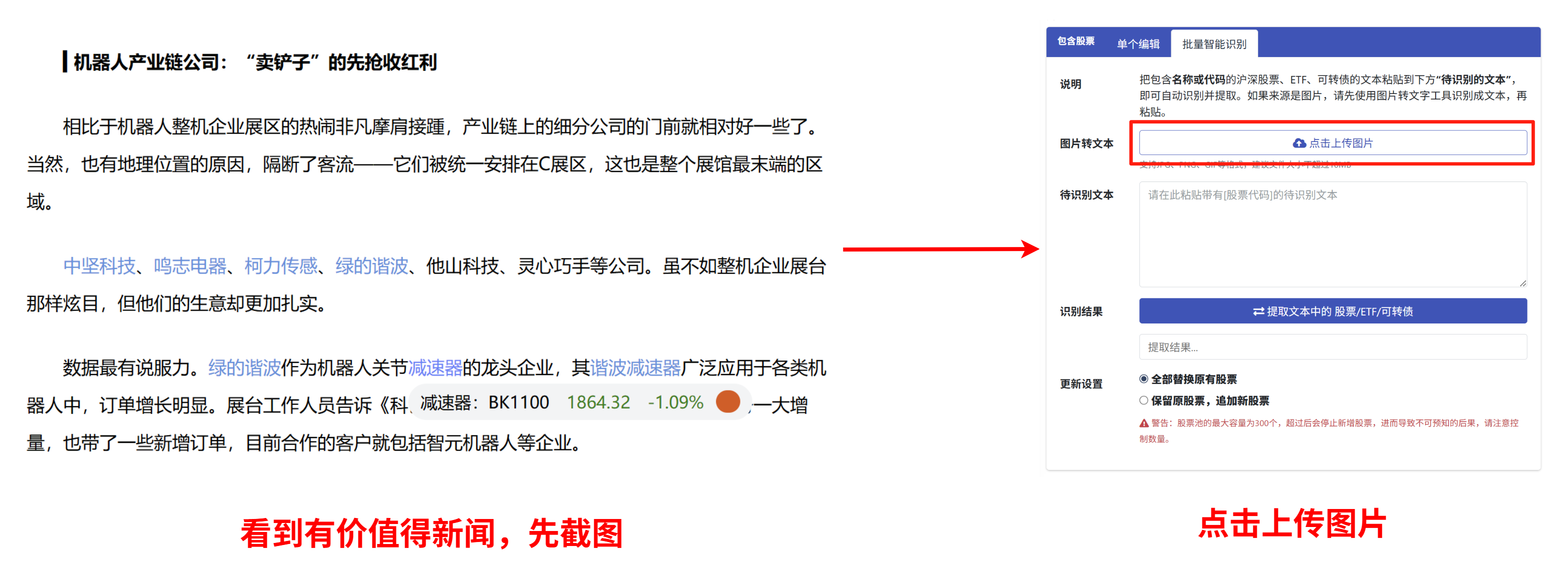 如果有发现有价值得新闻,想快速添加到股票池,可以选择批量智能识别。首先先将新闻截图,截图完成后,点击上传图片。