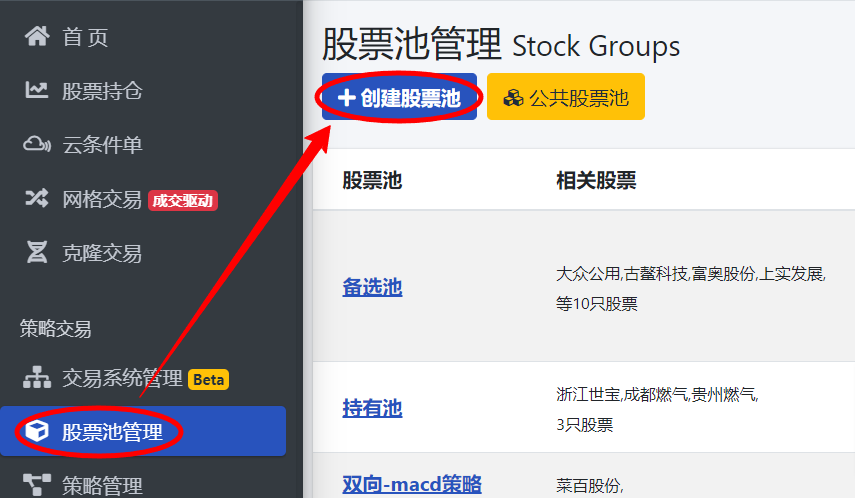 在股票池管理的界面中,通过对应股票池可以看到每个股票池都添加了哪些股票。