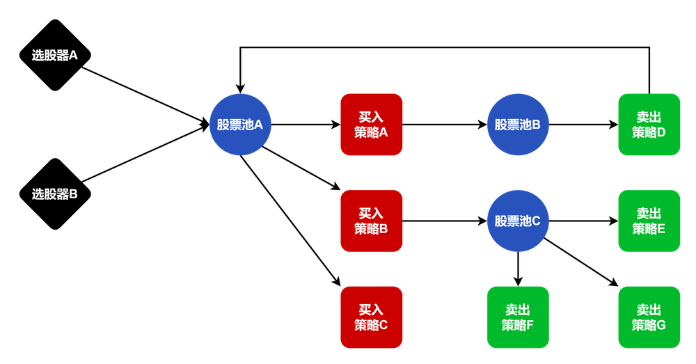 股票池在系统中充当了连接与容器的角色,是系统中的关键角色。通过股票池不仅可以连接策略和策略,从而创建一个循环交易系统,还可以想堆积木一样,随时在系统中添加选股器或策略。