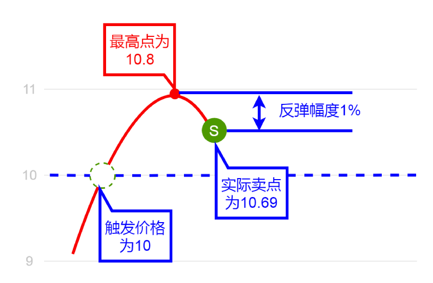 如图所示,创建一个网格交易并选择反弹幅度为1%的拐点交易,当股价快上涨跌到网格触发价10元时,并没有成交,而是继续等待,当股价到达10.8元时股价开始回落,到达10.69时满足反弹幅度1%的条件下单,所以市价买点10.69较触发价格10元有0.69的利润空间,增大了实际收益。