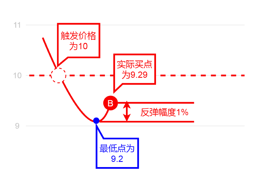 如图所示,创建一个网格交易并选择反弹幅度为1%的拐点交易,当股价快速下跌到网格触发价10元时,并没有成交,而是继续等待,当股价到达9.2元时开始反弹,到达9.29元时满足反弹幅度1%的条件下单,所以实际买点9.29元较触发价格10元有0.71元的利润空间,增大了实际收益。