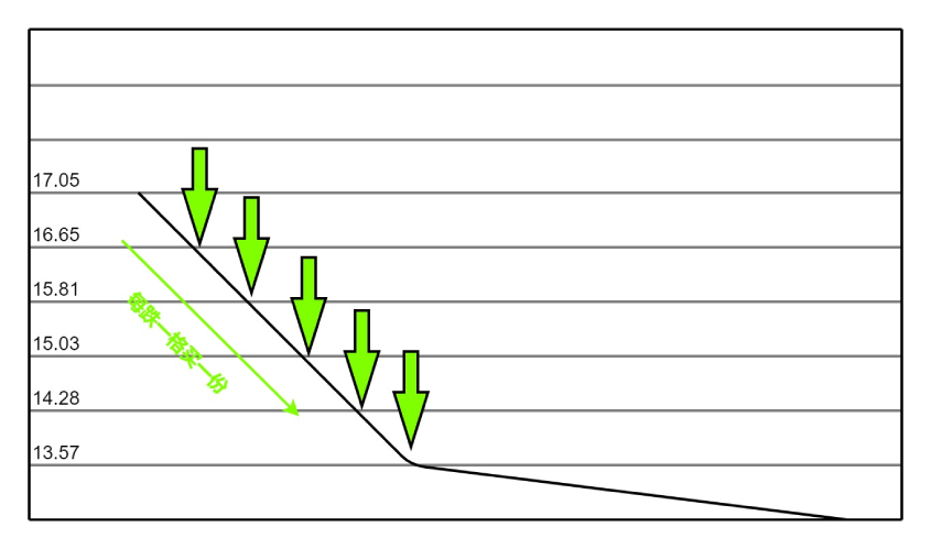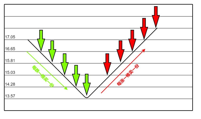 交易计划如图所示,每下跌5%,买入1份等数量的股票,上升第二格开始每上升一格减仓一份。