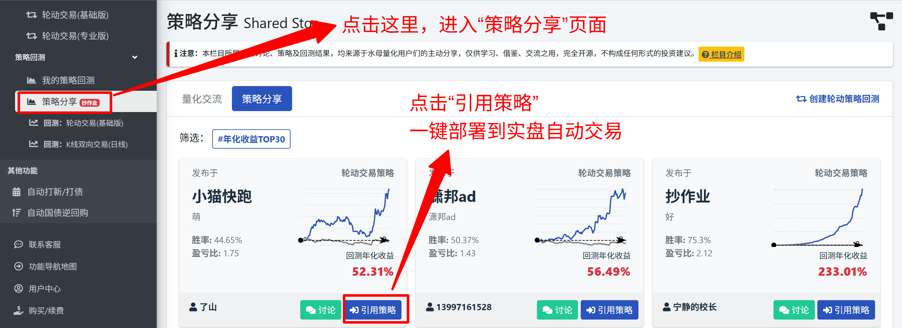 策略分享平台是什么图示使用教学策略分享平台是什么水母量化为用户提供了一个量化策略分享交流和学习的平台,如果您不知道如何设计量化策略、缺乏思路,可以在这里借鉴其他用户分享的策略和灵感,进一步调优、回测,设计成自己想要的策略,并可一键部署到实盘进行自动交易,方便用户学习、借鉴及交流。图示说明用户可点击引用工程,进入回测页面,查看相应策略的源码(tips:所有策略均开源,如对回测结果存疑,可使用相同条件在其他回测平台进行测试对比)使用教学 名称 视频(微信扫码观看) 文档更新时间: 2025-05-13 16:35 作者:admin