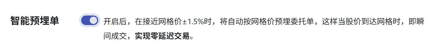 开启后,在接近网格价±1.5%时,将自动按网格价预埋委托单,这样当股价到达网格时,即瞬间成交,实现零延迟交易。