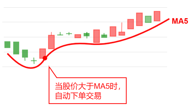 陈先生看好某股票,打算在1分钟K线图上等待股价上穿5分钟均价线,于是创建了均线买入策略,当股价大于MA5时,自动下单交易。