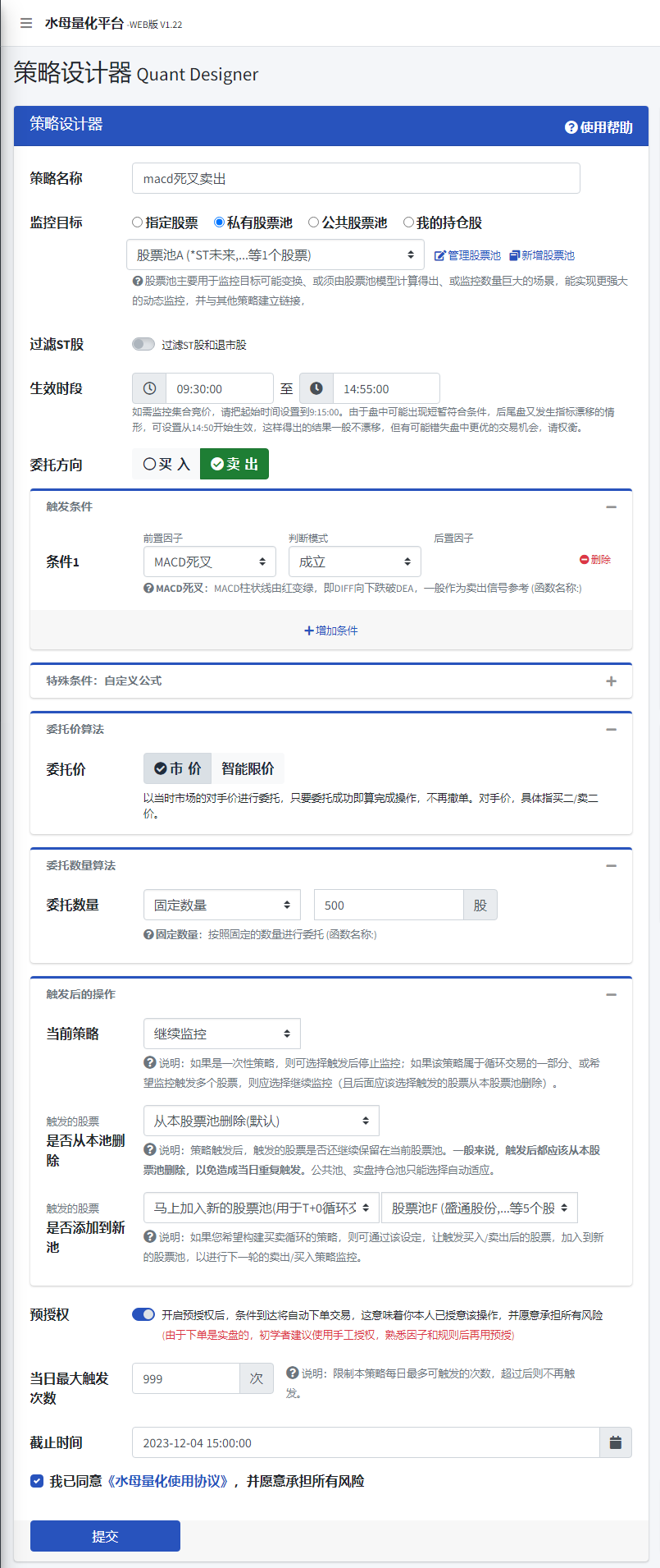 选择适合的委托价与委托数量,在触发后的操作中的当前策略选择继续监控,在是否从本池删除中选择从本股票池删除(默认),在是否添加到新池中选择马上加入新的股票池,然后再选择股票池处选择股票池A。点击提交,MACD死叉卖出的策略就完成了。当这两个策略条件单完成后即可完成MACD金叉买入死叉卖出的循环交易。