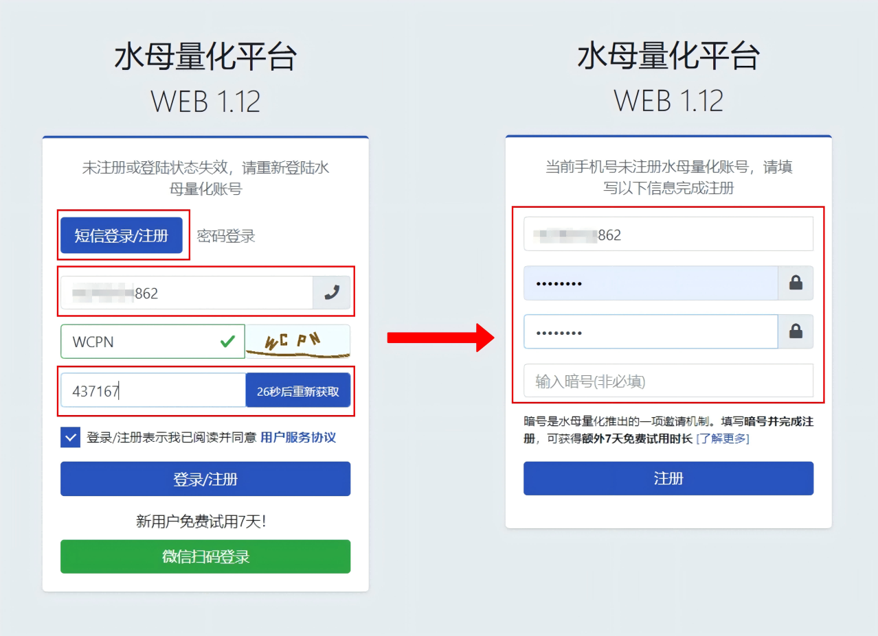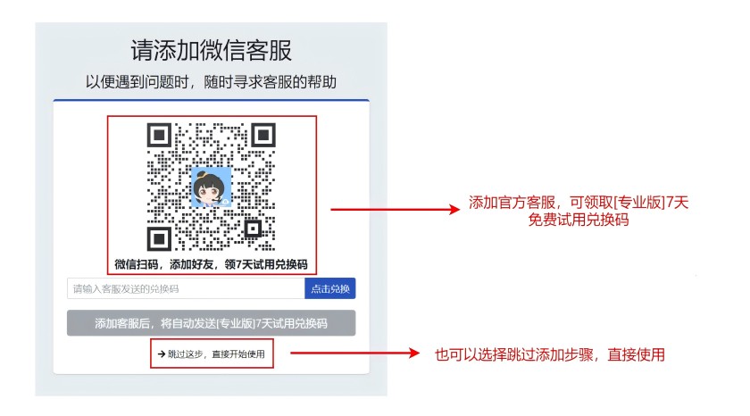 注册成功后,可扫码二维码添加水母量化官方客服,领取[专业版]7天免费试用兑换码,不领取可跳过此步骤