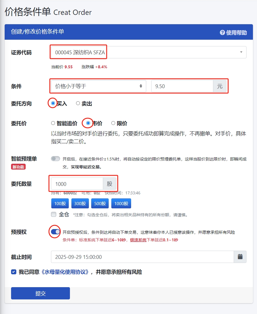 3、在价格条件单设置界面,输入股票代码,设置价格条件、委托方向、委托价、委托数量,最后勾选预授权及使用协议并点击提交。
