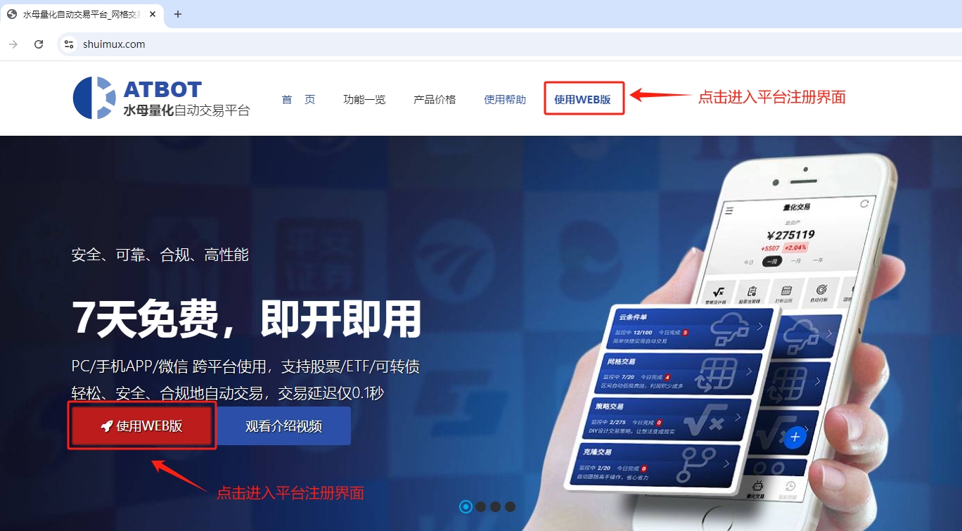 打开浏览器,百度搜“水母量化”( 或输入www.shuimux.com )进入水母量化官网,点击菜单栏“使用WEB版”可进入水母量化平台注册界面