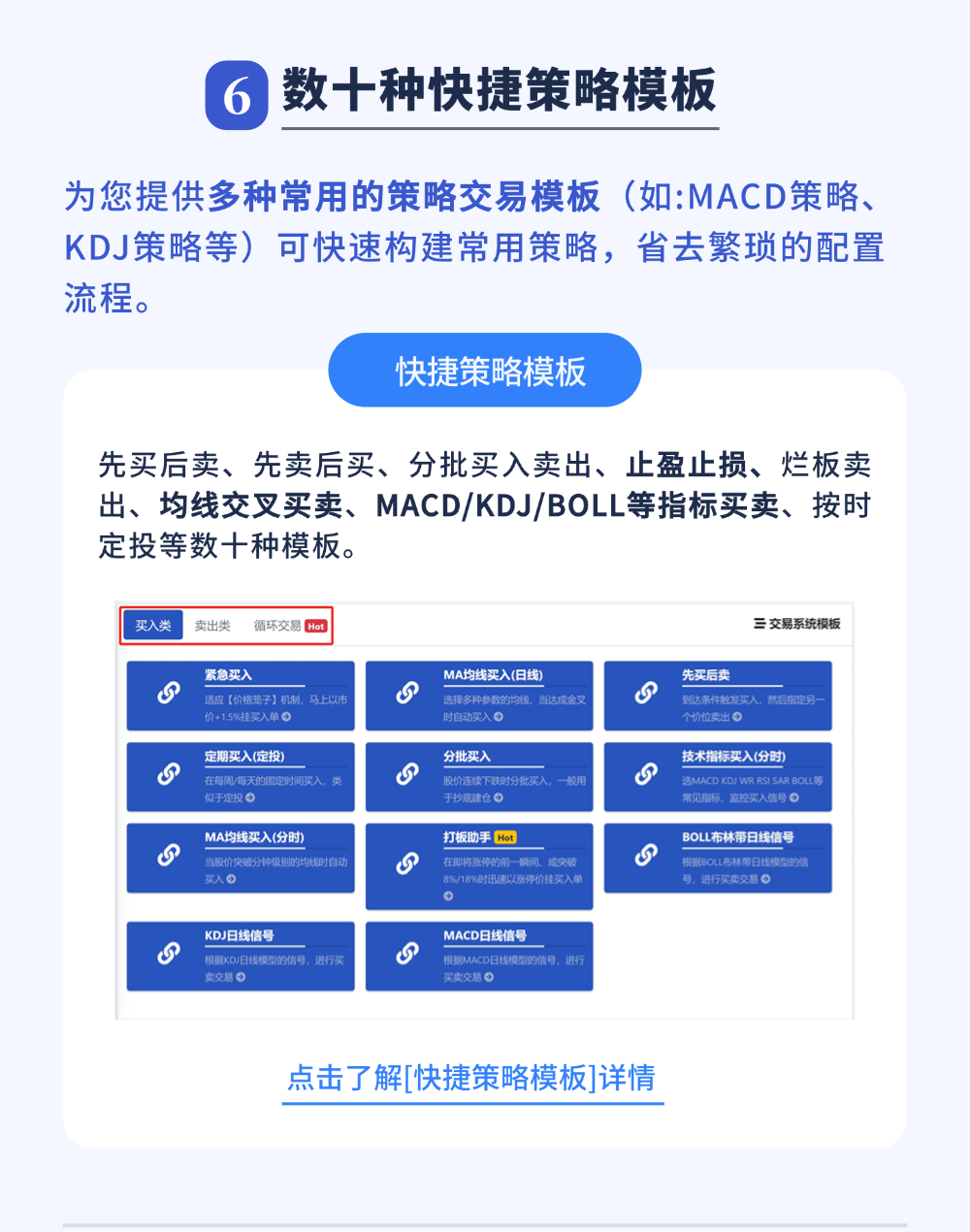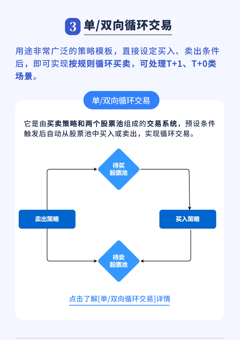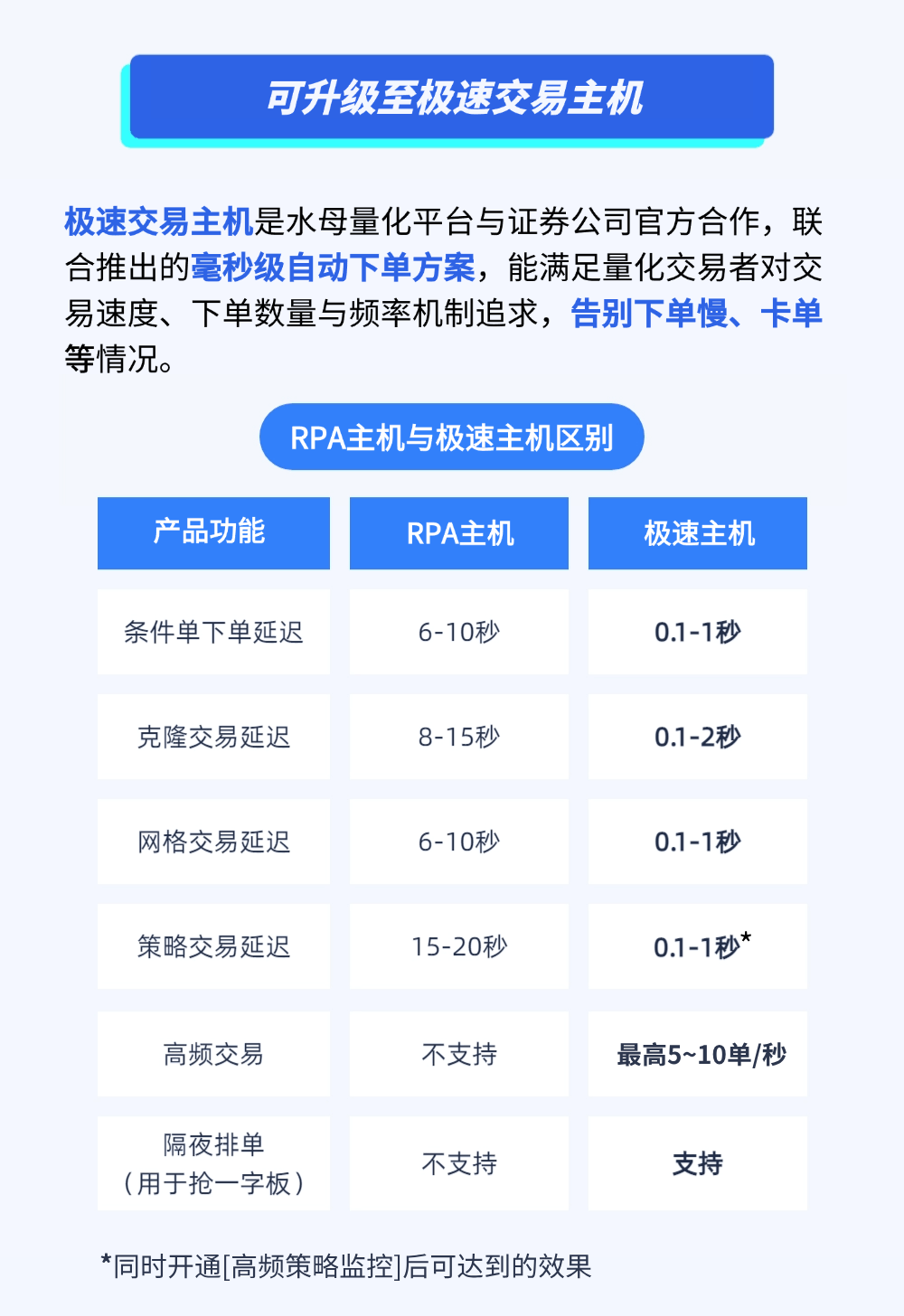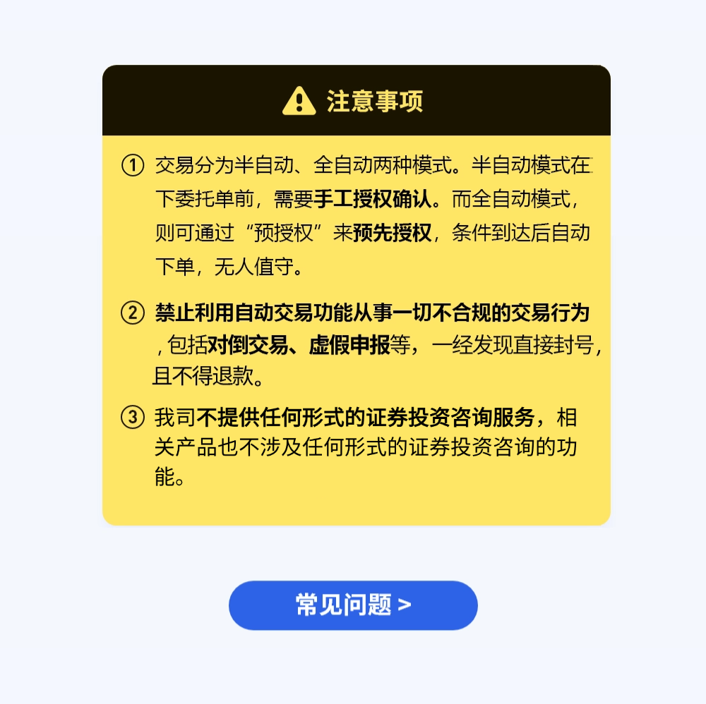 目录 搜索 什么是水母量化?本软件的优势比传统软件更高效安全、稳定、可靠功能一览(图文介绍)实现原理常见问题什么是交易主机?极速与AI主机有何区别?极速主机的典型使用场景严选券商产品定价联系我们新手指南水母量化全功能新手教程如何在微信使用水母量化WEB版?如何在pc端使用水母量化WEB版如何在app中使用水母量化?如何使用融资融券(信用账户)?如何方便快捷的进入服务号?如何绑定微信服务号网格交易类功能网格交易介绍功能详解运行原理(到价驱动型)网格驱动模式智能配对网格自动配对的规则智能预埋单拐点模式拐点交易单边买卖限制高低开优化关于高开/低开处理暂停高抛/低吸持仓限制强制买卖智能止盈底仓卖光的处理其他高级参数网格交易回测新手指南批量网格回测视频教程与案例回合制网格交易介绍智能化网格交易实战案例做与不做网格交易的区别创建网格交易设置AI主机网格设置极速主机网格设置策略交易类功能交易程序创建交易程序交易程序管理页可视化策略设计面板股票池股票池管理页股票池创建页策略交易功能及使用技巧批量导入第三方股票方法策略单策略单管理页策略单创建页函数因子一览表自定义公式使用说明设置案例三线共振止盈止损BOLL下轨买入上轨卖出KDJ金叉买入死叉卖出MACD金叉买入死叉卖出自动打板自动定投回合制网格交易DIY网格交易视频教程与案例策略交易功能及使用技巧构建任意周期的技术指标交易策略选股器选股器管理页选股器创建页选股器因子表选股器实战案例DIY自定义选股条件策略交易功能及使用技巧交易程序模板打板助手使用教程视频教程与案例打板客套餐撤单策略功能介绍零秒打板实战案例打板助手2.2介绍大单事件因子逃板助手视频教程与案例逃板助手介绍逃板助手实战案例轮动交易(基础版)轮动交易专业版与基础版的区别使用教程视频教程与案例轮动交易(专业版)轮动交易专业版与基础版的区别使用教程视频教程与案例分时双向交易模板支持T+0交易的分钟级指标因子正式上线分时双向策略模板使用教程使用教程视频教程与案例K线双向交易模板双向循环交易模板详解K线双向交易策略简介K线双向交易回测工具实战教程其他程序模板先买后卖定期买入打板助手开板卖出日内高抛低吸紧急买入紧急卖出止盈止损策略先卖后买回本卖出分批卖出分批买入均线死叉(日线)策略均线金叉(日线)策略指标卖出(分时)策略指标买入(分时)策略均线卖出(分时) 均线买入(分时)BOLL布林带策略MACD策略KDJ策略策略回测我的回测工程策略分享平台轮动策略回测(基础版)轮动回测介绍视频教程与案例K线双向策略回测(日线)用数千种因子回测5000多只股票,一分钟有结果:K线双向交易回测工具实战教程视频教程与案例克隆交易类功能克隆交易创建页克隆交易自适应买入克隆交易的注意事项视频教程与案例云条件单类功能云条件单管理页创建云条件单价格条件单时间条件单拐点条件单涨跌幅条件单AI助手自动打新/打债自动国债逆回购部分教学与案例培训课程回放视频教程直播课程第一期:轮动策略实战课程直播【2023.06.28 】第二期:轮动策略实战细节讲解【2023.07.13 】第三期:策略设计器实战细节讲解【2023.07.28 】第四期:水母量化成交驱动型网格讲解【2023.08.11】使用价格单来止盈止损使用拐点单让盈利最大化使用网格交易法-入门想要智能追涨杀跌,及时止盈止损,“涨跌幅条件单”或是你不二的选择水母量化教你如何创建一个最简单的条件单—价格条件单担心抄底抄到半山腰?水母量化教你如何使用拐点买入条件单安利一个自动赚钱的小功能~自动卖出逃顶的技巧水母量化实用功能介绍五种卖出逃顶技巧进入服务号的快捷方式常见问题A股的申报下单时间详解价格笼子机制什么是预授权模拟交易的宽松、仿真模式有何区别?委托方式介绍警惕非法的"云交易"、“微交易”重要声明更新日志2025.08.14 图片批量导入功能上线,添加股票/ETF/可转债更方便了2025.08.14 升级公告:策略单新增一批基本面因子2025.04.24 【批量网格回测】功能重磅上线2025.03.14 巧用策略单DIY回合制网格,克服传统网格面对单边行情的缺陷2025.02.20 T0革命:水母量化能用可转债日内指标进行T+0高频交易了2025.02.13 升级公告:【量化交流社区】栏目上线2025.01.03 防炸板利器来了——打板助手新增“撤单策略”功能2024.12.11 5、15、30分钟等多周期指标条件来了!双向交易(多周期)模板上线2024.10.30 逃顶神器:零秒逃板,锁定开板最佳卖点,精准止盈2024.09.26 零秒打板:打板助手2.0震撼上线,牛股妖股一网打尽!2024.09.24 毫秒触发!水母量化新增【高频策略监控】与【高频选股监控】功能2024.08.14 最后一块拼图——策略回测功能上线2024.06.17 升级公告:极速系统将支持【网格交易预埋单】功能2024.05.22 [可转债T0模板]上线,助你快速构建无限制T0套利策略2024.03.26 [解套宝T+0交易系统]上线!自动做T时代到来2024.03.07 升级公告:任务积分系统上线2024.01.18 分钟级【网格回测】上线,助你探寻最佳的网格参数2024.01.04 水母量化APP升级:智能表单上线2023.12.22 水母量化APP升级:可通过股票详情K线图查看历史买卖点2023-11-20 水母量化(安卓版)APP升级公告2023-10-19 交易系统收益统计功能上线2023-10-10 网格交易新增【等差网格】模式2023-10-10 告别高买低卖,网