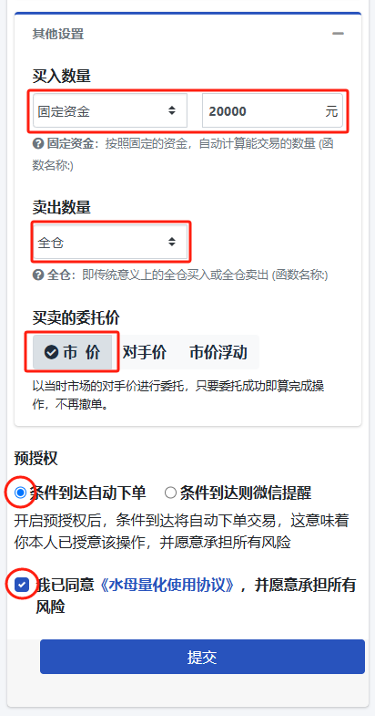 最后,我们只需要填入需要买卖的委托数量、买卖的委托价以及勾选预授权和使用协议并提交,即可自动生成全自动实盘交易程序。