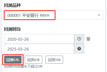 进入设置页面后,首先需要设置回测品种。我们随意选择了一只股票:000001(平安银行)。然后设置回测的时间范围为5年,因为回测的时间越长,样本数据越多,结果才更具参考性。