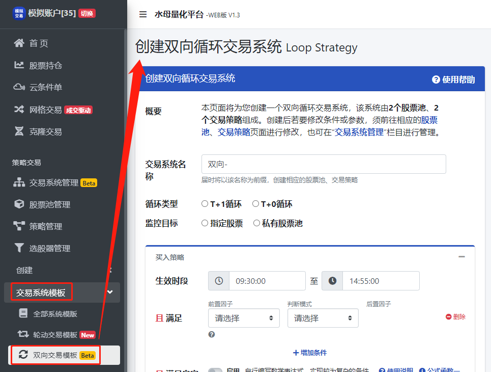 【双向循环交易程序模板】是水母量化为简化循环交易设置的流程,设计出来的一个同时具备买入和卖出两套策略的交易程序。(目前双向模板仅支持水母量化PC版和微信版,可通过左侧“交易程序模板”的双向交易模板进入)