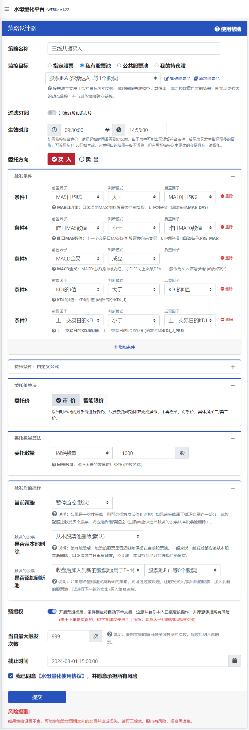 9、勾选预授权和《水母量化使用协议》的选项,这样就不需要人工再次确认,直接执行交易策略,点击提交,三线共振买入的策略就完成了。