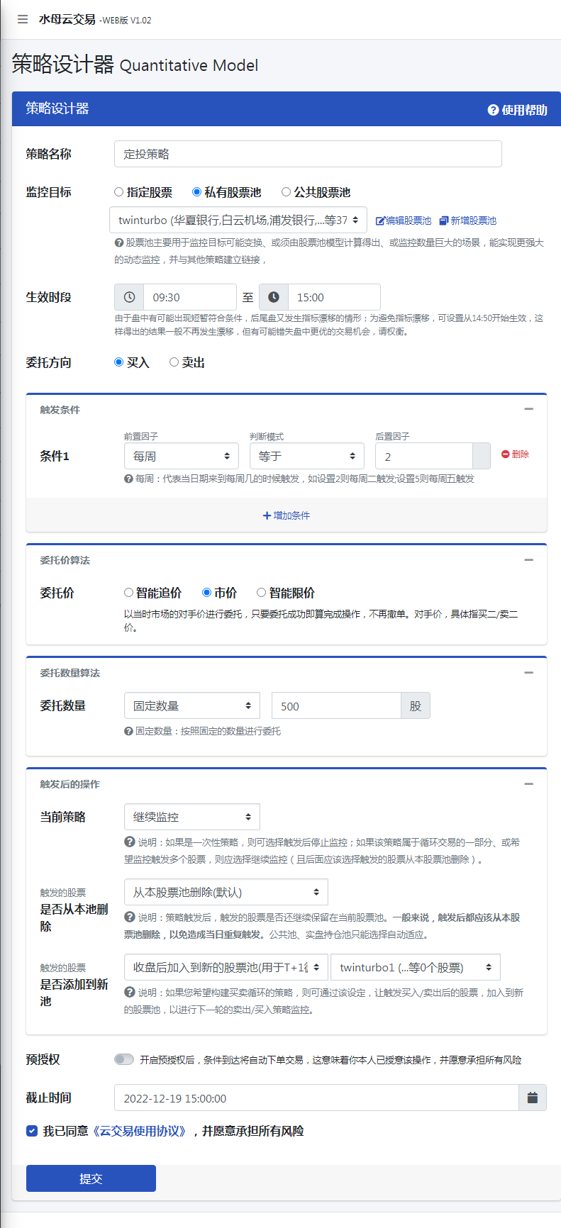水母量化交易系统正式上线策略设计器 策略设计器是一种无需编程,也可基于数百种条件和因子,自由构造您想要的一切自动交易策略,甚至互相链接实现自循环永续交易的强大工具。 在这个功能下可以通过对不同因子的组合实现满足多种交易场景的需求。例如可以通过时间类因子的每周固定时间买入固定份额的股票来实现自动定投 文档更新时间: 2025-08-15 18:16 作者:admin