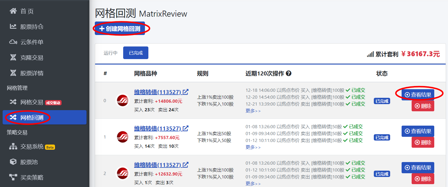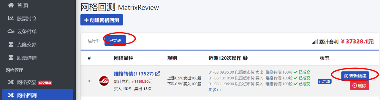 完成设定后,选择是否免5,点击“开始回测”。系统将根据您设定的参数自动执行网格回测。