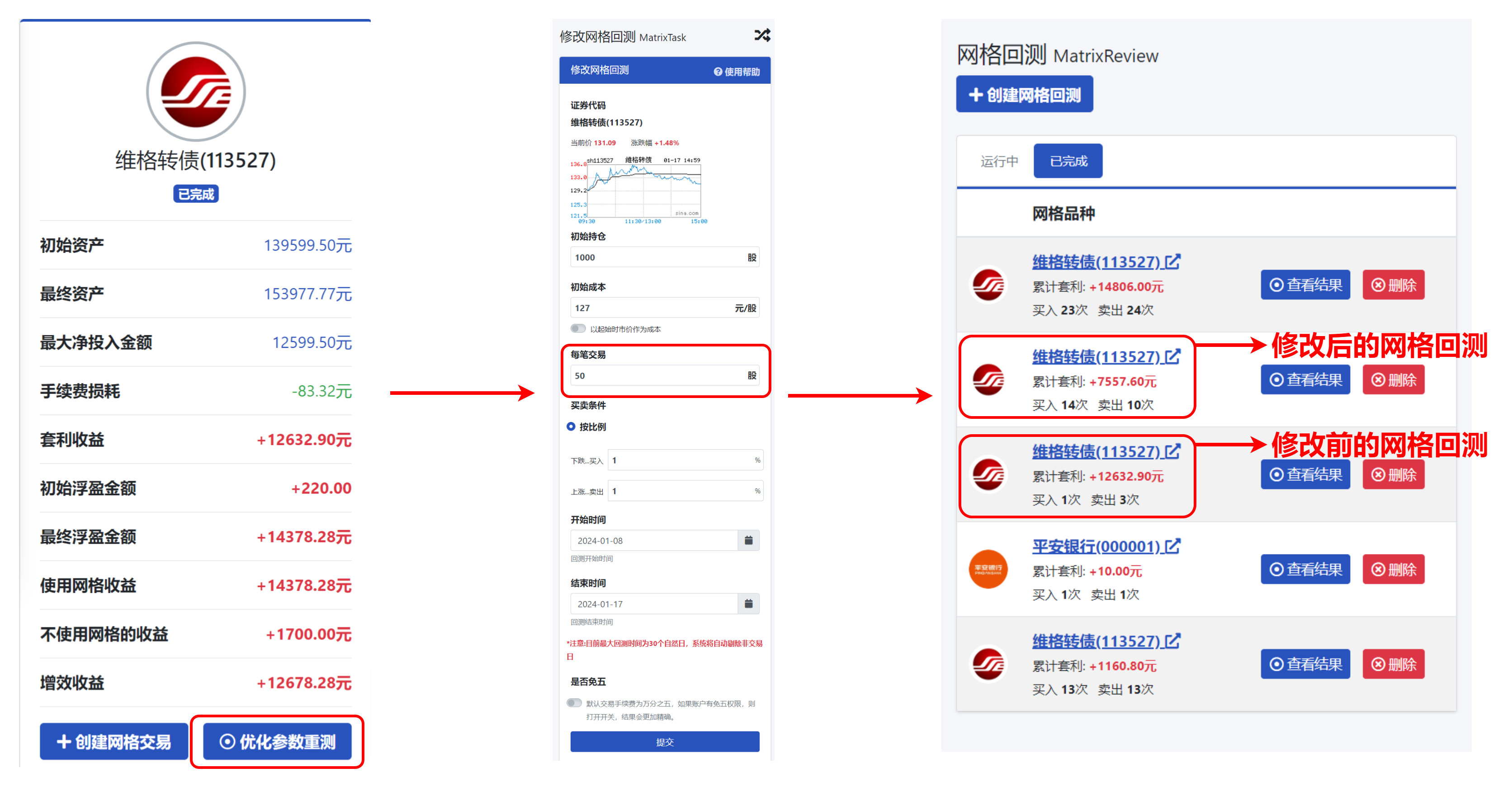 如果您想调整策略,只需点击“优化参数重测”,修改参数后即可重新进行回测。重新回测后,系统将重新生成一个新的网格二回测二结果,方便于未修改的网格回测进行比对,方便做出更优参数的选择。
