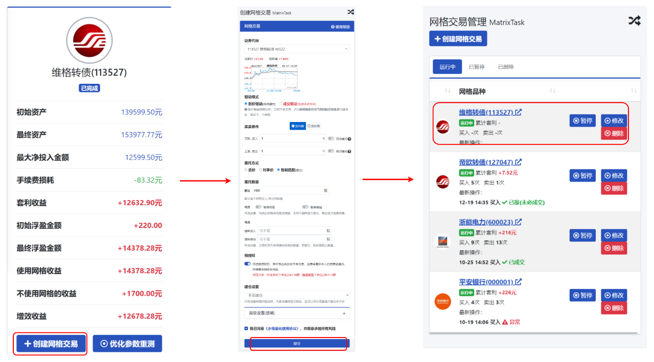 满意回测结果后,您可以直接点击“创建网格交易”,按照当前参数快速设置相同的网格交易。