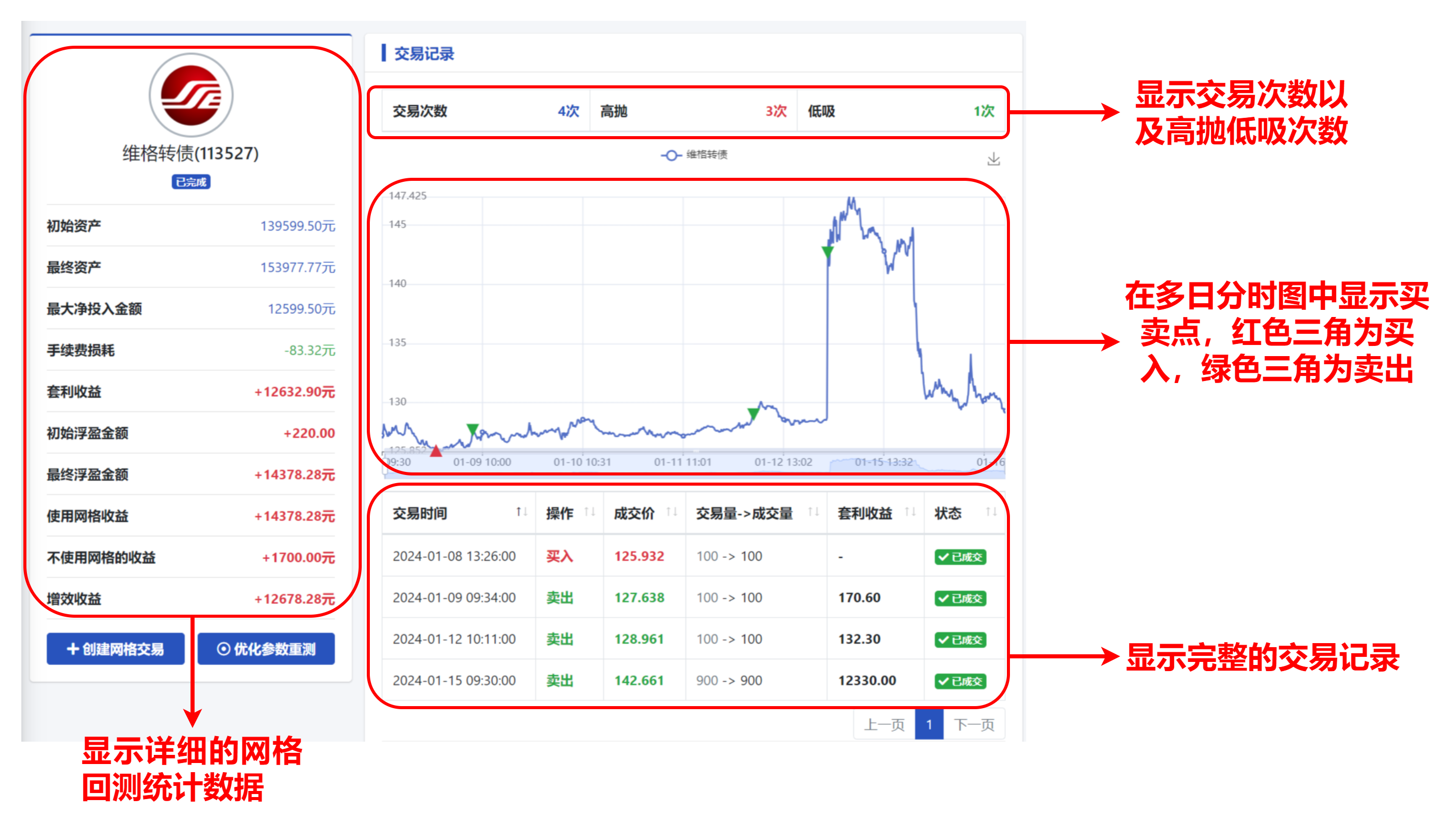 点击“查看结果”,即可进入到网格回测结果页面。在这里,您不仅可以查看详细的网格回测统计数据,还能浏览完整的交易记录,并通过分时图直观展示交易过程。