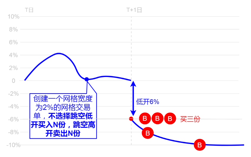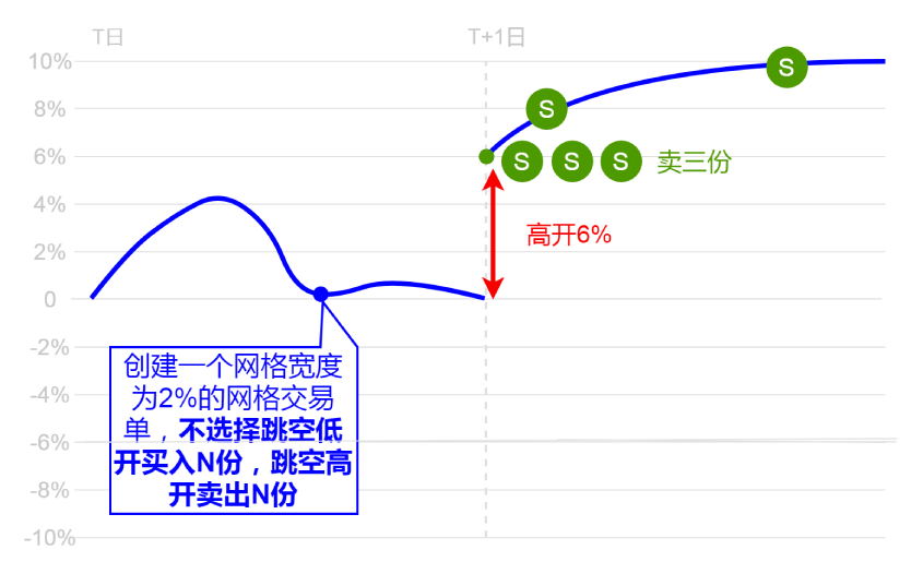 如上图所述,创建一个网格宽度为2%的网格交易,如果不选择跳空低开买入N份,跳空高开卖出N份,则在第二天大幅度低开时只会买入1份委托数量,没有在低位吸收到足够多的低廉筹码,当股价低开高走时无法使自己的利润最大化。