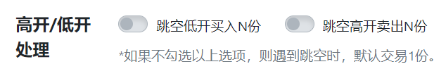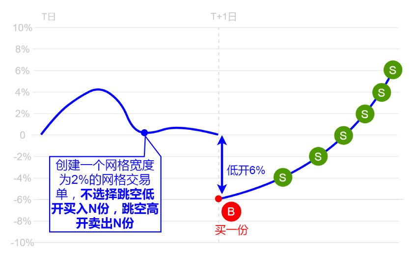 为了解决在第二天开盘跳空高开或跳空低开而错过低吸或高抛的情况,我们设计了网格交易的高开/低开处理的方法,以此让用户的套利利润更大化,此方法也更加准守网格交易的规则,更符合网格交易的运行模式。