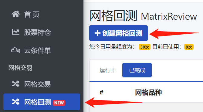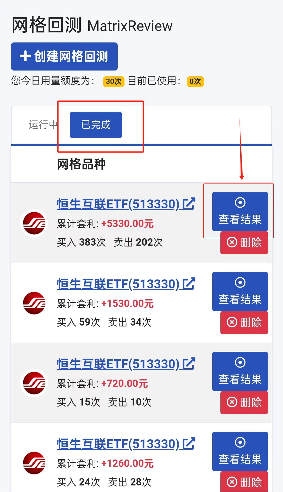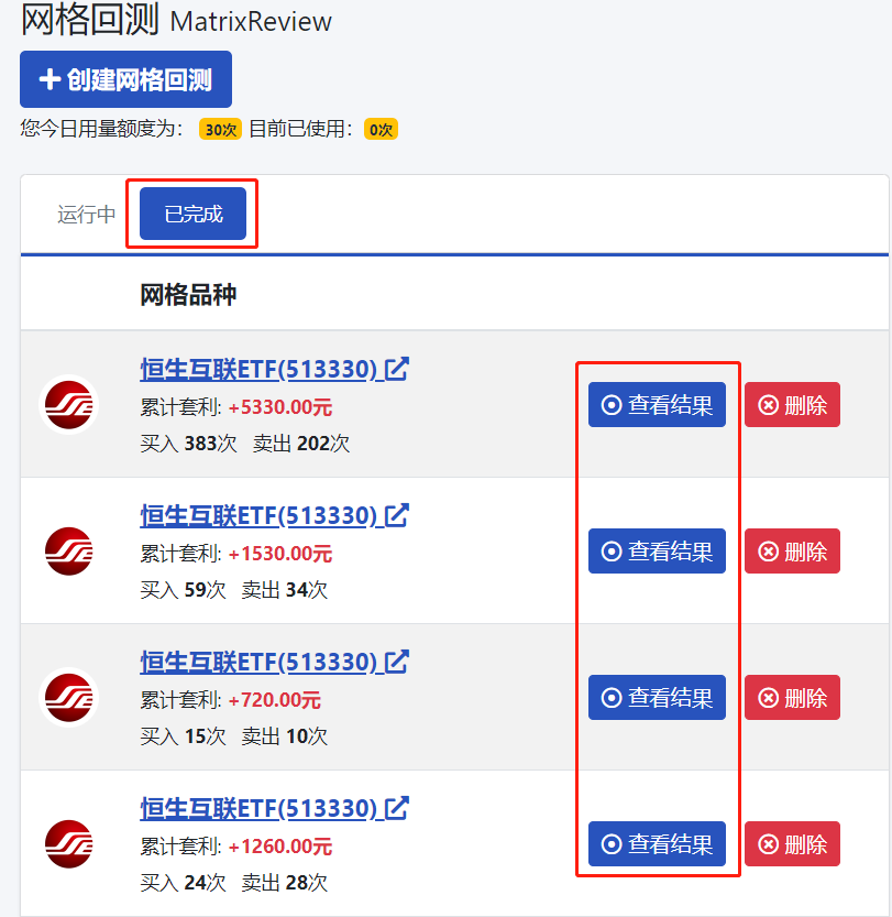 进入网格回测页面,点击“已完成”查看网格回测结果
