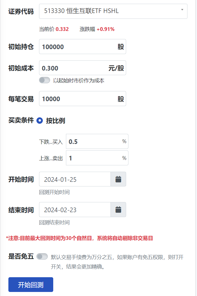 - 选定回测目标:以恒生互联网ETF(代码:513330)为例作为回测对象。