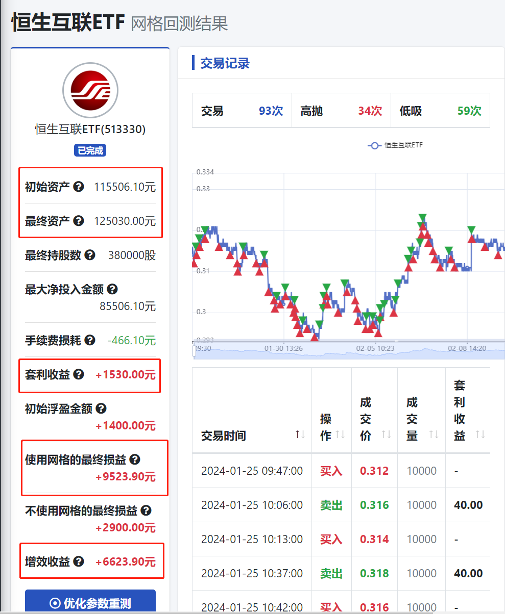 如您对首次回测不满意,我们提供了一个优化参数的选项,在左下角的界面中,您可以点击“优化参数重测”按钮,进行多组测试,以找到最佳的参数组合。这样的优化过程将为接下来的实战打下坚实的基础,帮助您更好地理解和应用量化交易,并提升您的交易技巧。