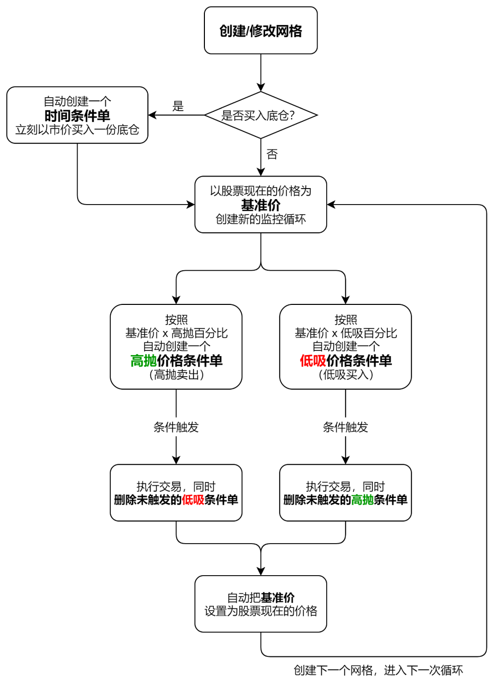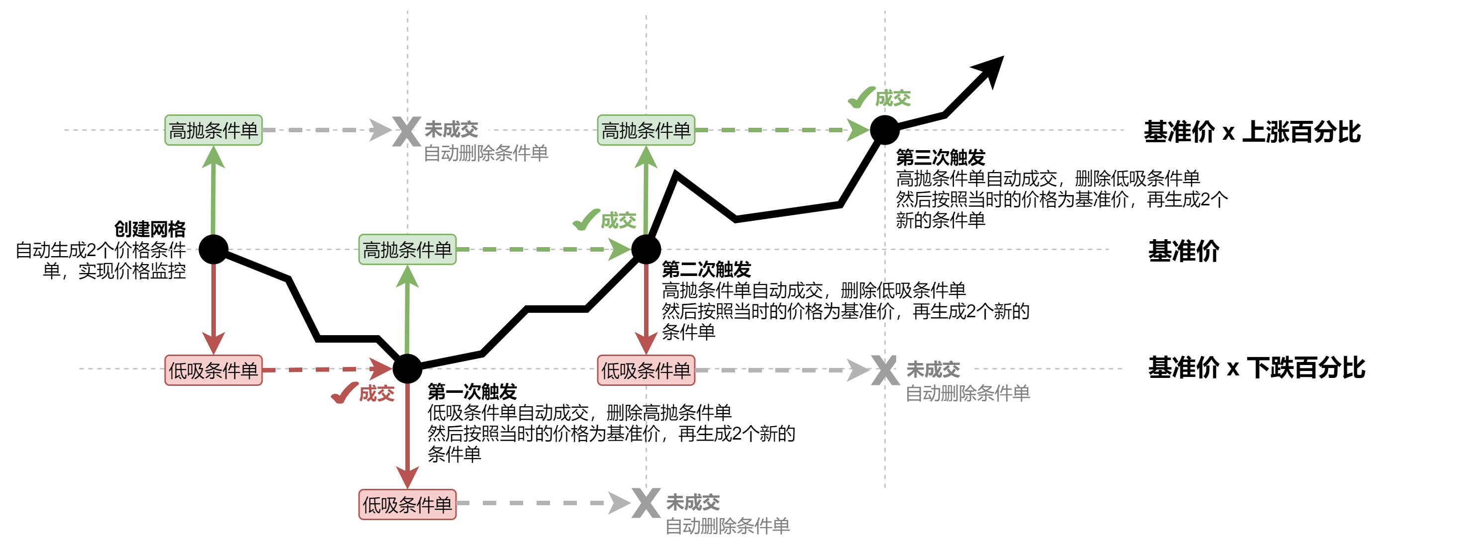 当价格跌到触发低吸条件单时,低吸条件单自动成交,并删除高抛条件单,然后按照当时的价格为基准价,再生成新的高抛和低吸的价格条件单;当股价上升触发高抛条件单时,高抛条件单自动成交并删除低吸条件单,然后按照当时的价格为基准价再生成新的高抛和低吸的价格条件单,循环往复。(具体可参考网格交易)