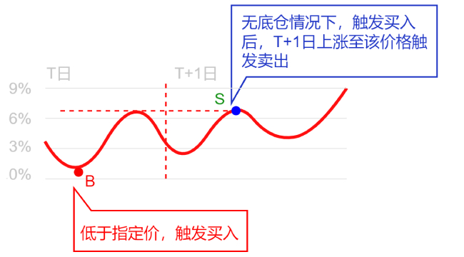 2、后卖价格:触发买入后,上涨至该价格触发卖出。卖出触发时,模型将自动适配T+1规则,如果买入当天能卖出则会执行卖出(比如有底仓的情况下),如果买入当天无法卖出则自动顺延到T+1日再进行判断。