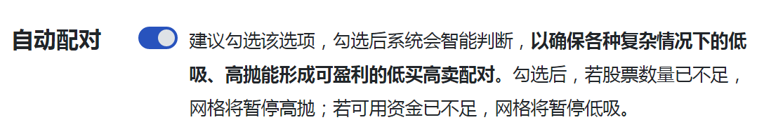 我们使用网格交易时,若遇上交易失败或轮空,可能会导致下一个网格出现“平买平卖”的问题,有违网格交易尽可能“低买高卖”的初衷。为此我们添加了自动配对功能,以此保证用户的网格交易在复杂情况下也可以正常运行,此功能更加遵守网格交易的规则,更符合网格交易的运行模式。